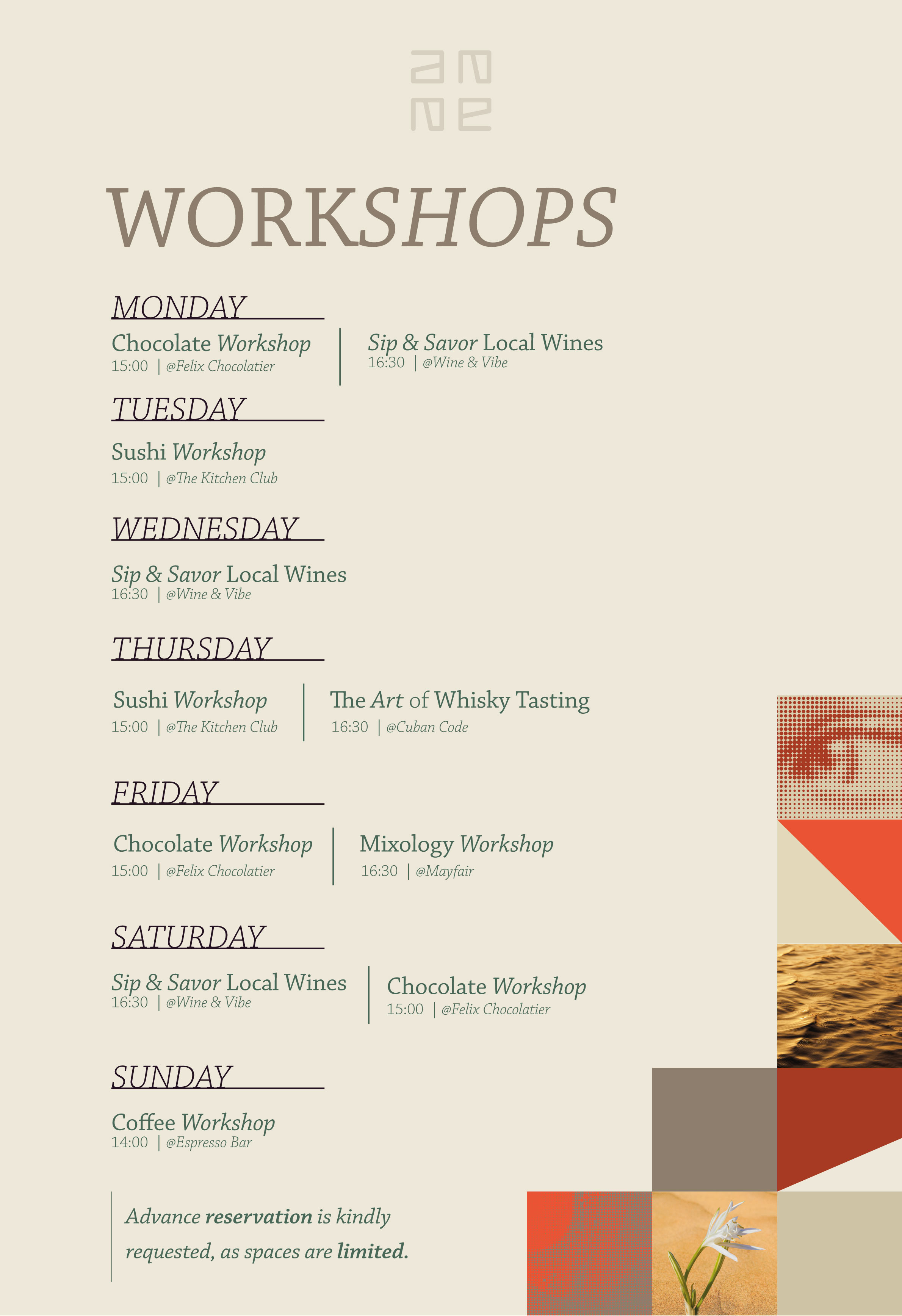 At Ethno Belek, every moment is filled with inspiration. Our exclusive workshop series invites you on a sensory journey where gastronomy meets craft. From the magic of chocolate to the vibrant world of mixology, from refined wine and whisky tastings to hands-on sushi and coffee experiences — learn something new and enjoy the moment in our thoughtfully curated setting.